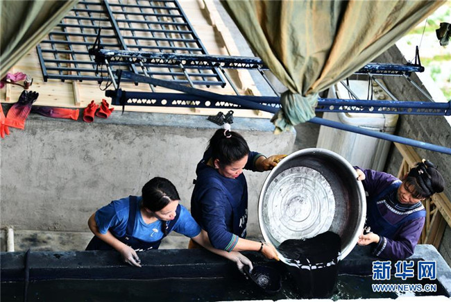 楊成蘭(左一)和村民一同把植物制作的染料倒入染缸(5月28日攝)。新華社記者 楊文斌 攝