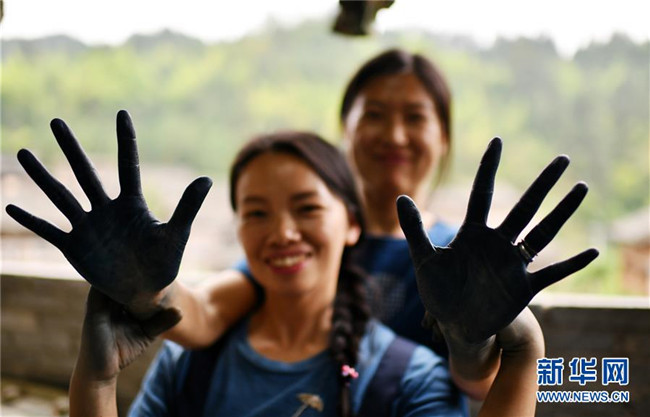 楊成蘭(前)與一名學徒在展示被植物染料染黑的雙手(5月28日攝)。新華社記者 楊文斌 攝