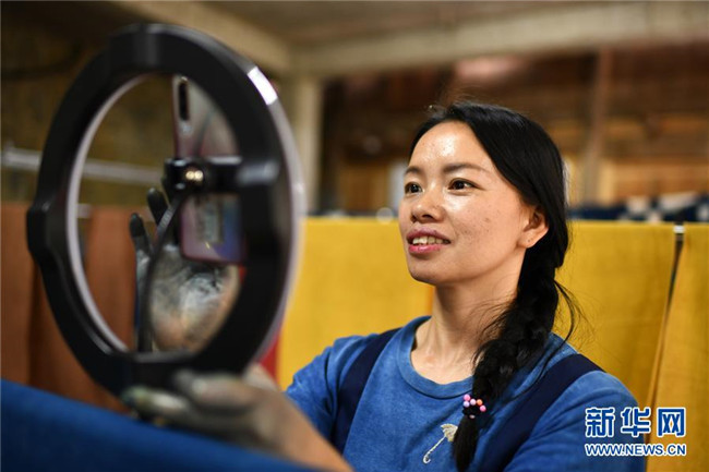 楊成蘭在用手機對侗族土布植物染色技藝進行網(wǎng)絡(luò)直播(5月28日攝)。新華社記者 楊文斌 攝