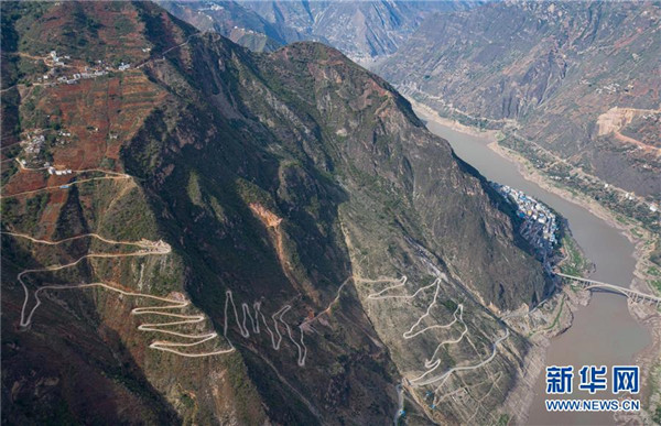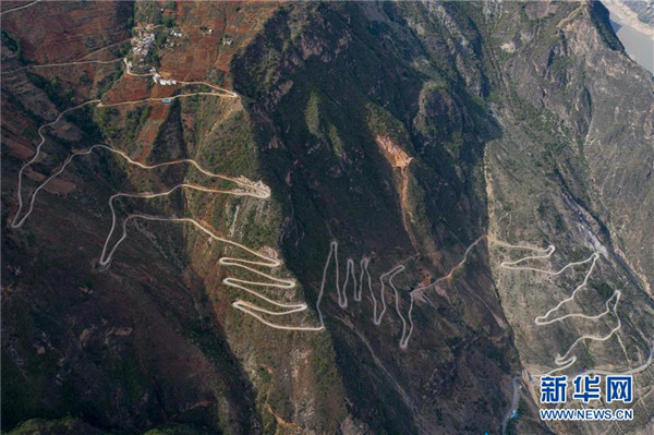 金陽縣蘆稿鎮(zhèn)大灣子村12公里左右的通村公路,28個(gè)彎蜿蜒盤旋在金沙江峽谷懸崖絕壁邊(6月7日攝,無人機(jī)照片)。坐落在金沙江畔的四川省金陽縣是國(guó)家級(jí)深度貧困縣,境內(nèi)群山連綿起伏,海拔落差大,眾多村寨處于高山或者高半山上,道路施工難度大。近年來,當(dāng)?shù)卣畬⒔煌ㄗ鳛槊撠毠?jiān)的先導(dǎo)性工程,路越修越寬、越修越好,成為當(dāng)?shù)厝罕姷拿撠氈赂宦贰=刂?019年底,金陽縣實(shí)現(xiàn)所有鄉(xiāng)鎮(zhèn)通油路、建制村通硬化路,鄉(xiāng)道里程達(dá)329.9公里,村道里程達(dá)866.8公里。新華社記者江宏景攝