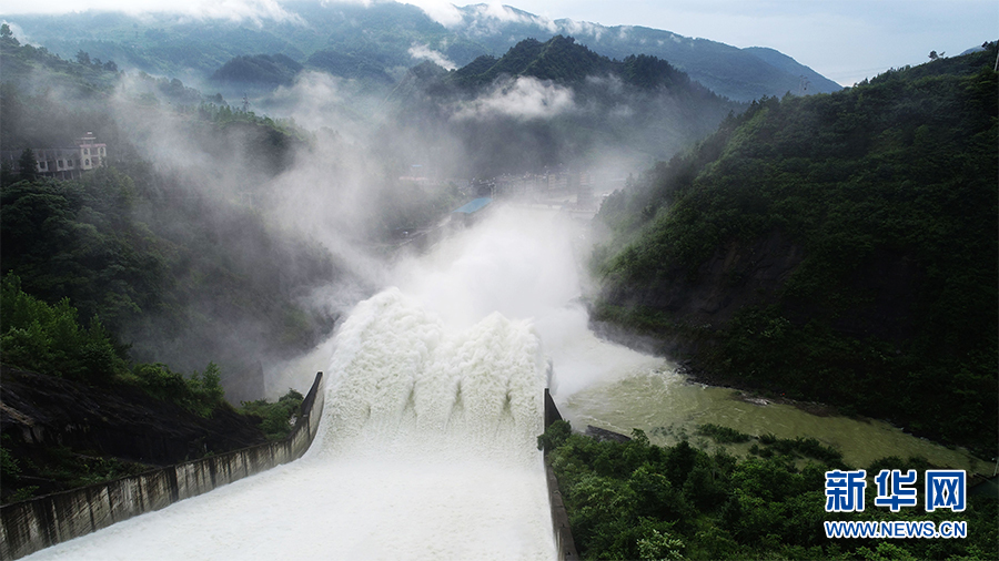 受近段時(shí)間的強(qiáng)降雨影響,重慶市酉陽(yáng)縣多條河流河水猛漲,部分水庫(kù)接近汛限水位。6月18日,位于酉陽(yáng)縣境內(nèi)的金家壩水庫(kù)開閘泄洪,確保水庫(kù)安全。新華網(wǎng)發(fā)(陳碧生 攝)