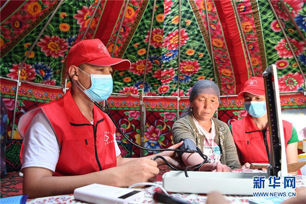 6月20日,新疆阿勒泰地區(qū)布爾津縣也格孜托別鄉(xiāng)克孜勒托蓋村村醫(yī)在布爾津縣黑流灘草原給牧民巴合提古麗·塔拉甫汗檢查身體。圍繞實(shí)現(xiàn)人人享有基本醫(yī)療衛(wèi)生服務(wù)目標(biāo),2016年起,新疆布爾津縣開展家庭醫(yī)生簽約服務(wù)工作。該縣組建家庭醫(yī)生簽約團(tuán)隊65個,團(tuán)隊醫(yī)務(wù)人員233名,通過手機(jī)APP、基本公衛(wèi)系統(tǒng)與全縣建檔立卡貧困戶進(jìn)行電子化簽約,提升村醫(yī)隨訪的工作效率和質(zhì)量。截至目前,已完成簽約42936人,履約40043人。新華社記者沙達(dá)提攝