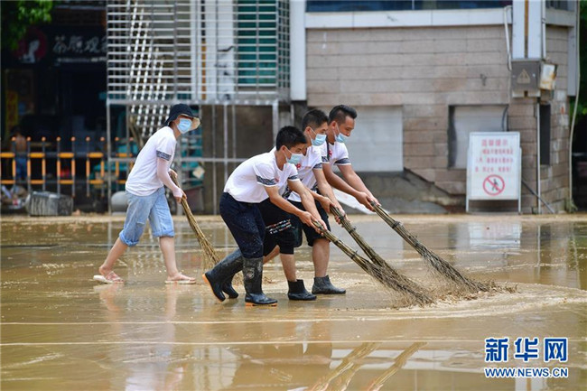 7月12日,融水苗族自治縣文化體育廣電和旅游局清淤小分隊在蘆笙廣場清理地面。 新華社記者 黃孝邦 攝