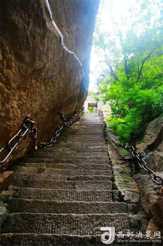 玉泉院出發(fā)直上到達華山門(步行登山路入口)。徒步經五里關、莎蘿萍、毛女洞、青柯萍、回心石、千尺幛、百尺峽、群仙觀、老君犁溝后,到達北峰。全長約6公里,耗時3小時左右。