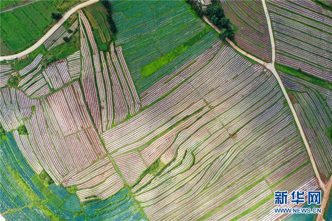 7月14日,村民在貴州省畢節(jié)市威寧縣草海鎮(zhèn)中海村的蔬菜基地里勞作(無人機照片)。新華社發(fā)(羅大富 攝)