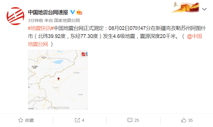 新疆克孜勒蘇州阿圖什市發(fā)生4.6級地震