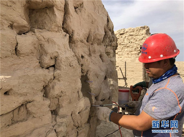 這是搶險加固中的樓蘭古城三間房遺址(7月27日攝,手機照片)。新華社發(fā)(中鐵西北科學研究院有限公司提供)