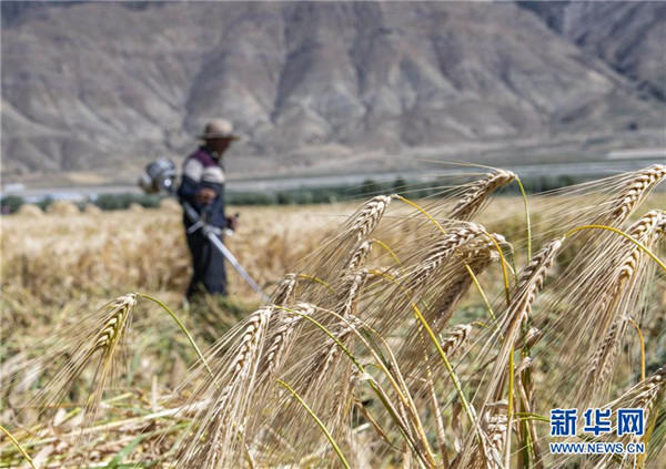 8月29日,農(nóng)民在日喀則市江孜縣的青稞田里忙收割。日喀則是西藏重要的商品糧基地,被譽(yù)為“西藏糧倉”。當(dāng)前正值青稞收獲季節(jié),當(dāng)?shù)剞r(nóng)民抓緊收割,農(nóng)田里一片繁忙景象。新華社記者孫非攝