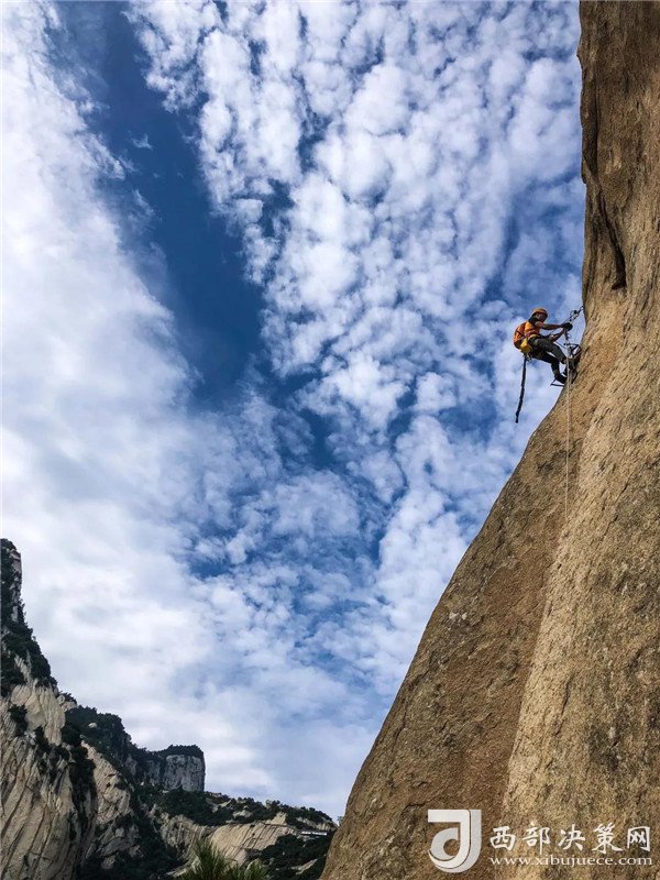 自然巖壁結(jié)組挑戰(zhàn)賽選手成功登頂。挑戰(zhàn)了華山白云峰六百多米的花崗巖大巖壁,并在巖壁上生活了兩天,不僅向大家展示了運動員的專業(yè)攀巖技術(shù),更展示了超強的野外生存能力。