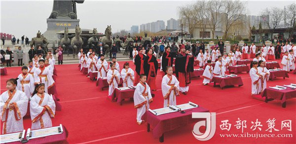 西安百余名學(xué)童在西安漢城湖舉行漢服開(kāi)筆禮