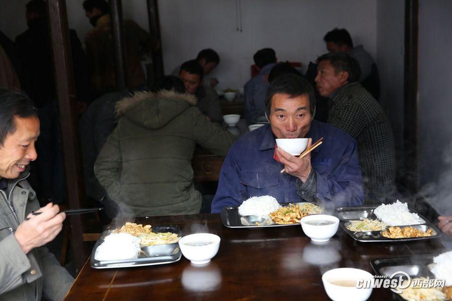 72行手藝人在作坊小鎮(zhèn)上班,中午到食堂吃免費(fèi)工作餐。