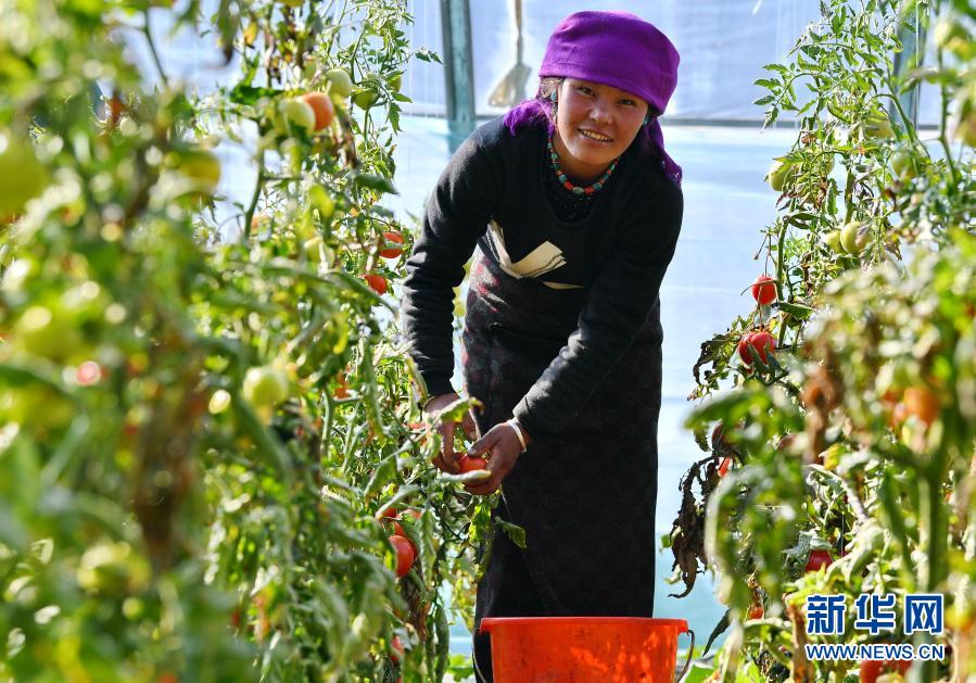 在西藏日喀則白朗國家級蔬菜標準化生產(chǎn)示范區(qū),白朗縣巴扎鄉(xiāng)查吾沖村村民次仁片多在蔬菜大棚里采摘西紅柿(3月2日攝)。新華社記者 張汝鋒 攝