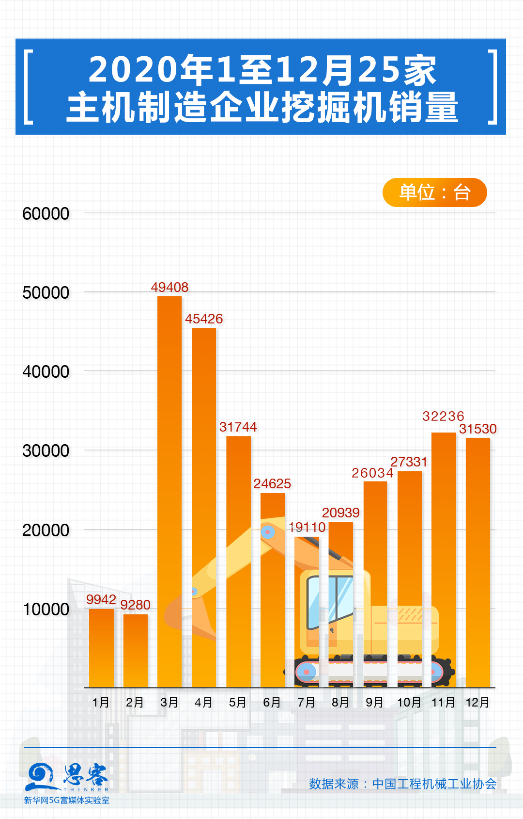 挖掘機銷量素有中國經(jīng)濟“溫度計”之稱。據(jù)中國工程機械工業(yè)協(xié)會統(tǒng)計,2020年12月納入統(tǒng)計的25家挖掘機制造企業(yè)共銷售各類挖掘機31530臺,同比增長56.4%;全年共銷售挖掘機327605臺,同比增長39%。從百萬億里程碑和挖掘機銷量增長的背后,我們看到了怎樣的中國經(jīng)濟活力與圖景?