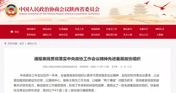 中央政協(xié)工作會(huì)議召開一年多來(lái),陜西全省各級(jí)政協(xié)組織認(rèn)真貫徹落實(shí)會(huì)議精神,堅(jiān)持建言資政和凝聚共識(shí)雙向發(fā)力,推動(dòng)政協(xié)工作提質(zhì)增效,形成了許多新的經(jīng)驗(yàn)和成果,涌現(xiàn)出了一批先進(jìn)基層政協(xié)組織。2020年11月2日,省政協(xié)十二屆四十七次主席會(huì)議決定通報(bào)表?yè)P(yáng)貫徹落實(shí)中央政協(xié)工作會(huì)議精神先進(jìn)基層政協(xié)組織,金臺(tái)區(qū)政協(xié)、富平縣政協(xié)、富縣政協(xié)和柞水縣政協(xié)4家縣(區(qū))政協(xié)組織榜上有名。