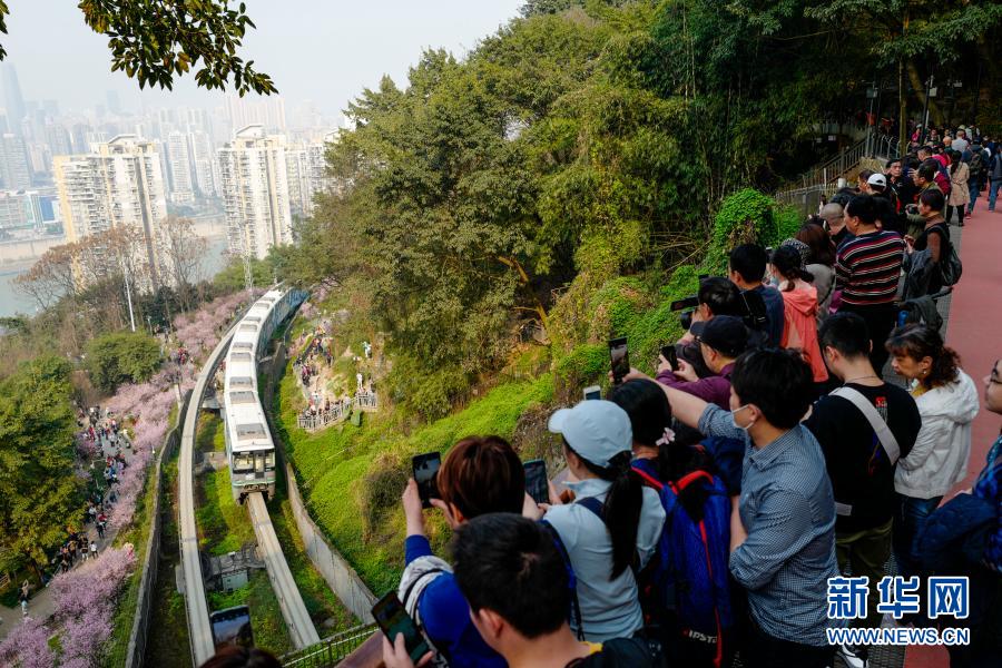 2月23日,在重慶軌道交通2號線佛圖關(guān)段,游客在山城步道上拍攝穿越花海的單軌列車。新華社記者 劉潺 攝