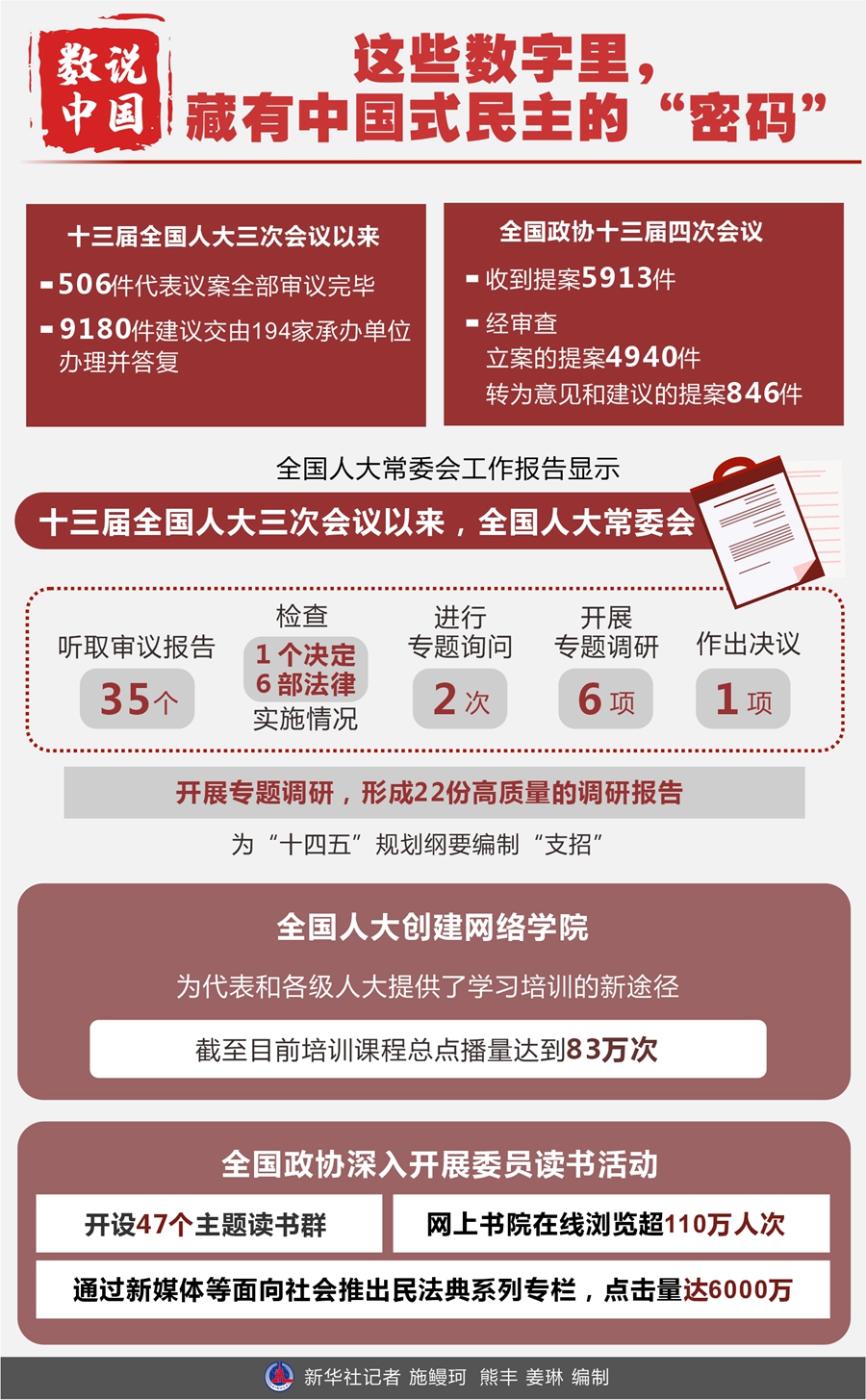 數(shù)字,蘊(yùn)藏中國(guó)式民主的“密碼”。透過(guò)全國(guó)人大常委會(huì)工作報(bào)告、全國(guó)政協(xié)常委會(huì)工作報(bào)告和提案工作情況報(bào)告,讓我們從幾組關(guān)鍵數(shù)據(jù)進(jìn)行“解碼”。