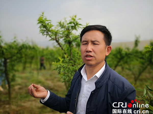 金葉騰種植基地負責人葉友誼在果園內介紹情況 攝影:黎萌