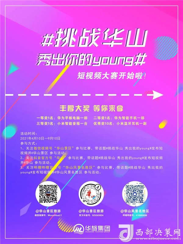 朝氣蓬勃的青年學生擁有敏銳的感受力和發(fā)現(xiàn)美的能力。為了進一步挖掘華山獨特自然風光及厚重的文化內涵,激發(fā)大學生群體的創(chuàng)作才能,華旅集團營銷中心特向大學生推出“挑戰(zhàn)華山 秀出你的young”短視頻大賽,在比賽之余,可圍繞華山自然風光、人文歷史、傳說典故、道教文化等進行創(chuàng)作,以年輕人的視角展示華山獨特之美,活動自4月10日起,在微信視頻號(華山景區(qū))、抖音APP(華山)、嗶哩嗶哩(華山風景名勝區(qū))等平臺正式啟動。