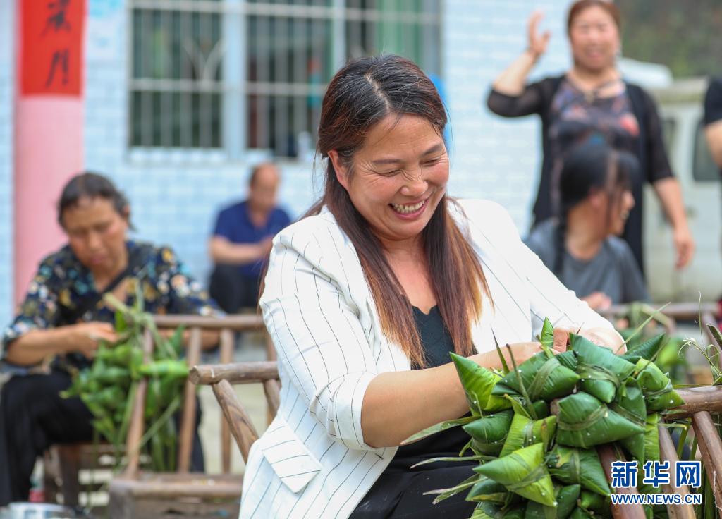 6月2日,貴州省銅仁市玉屏侗族自治縣亞魚鄉(xiāng)郭家灣村村民展示自己包的粽子。新華社發(fā)(胡攀學攝)