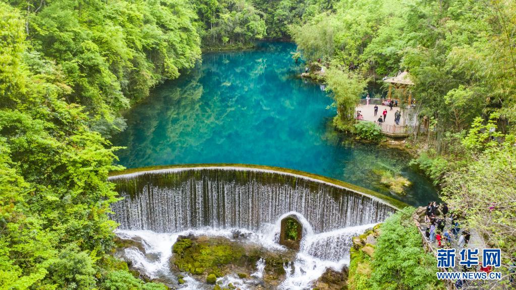 游客在荔波縣小七孔景區(qū)游玩(4月15日攝,無人機照片)。新華社記者 陶亮 攝