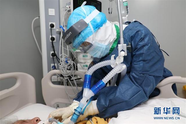 海軍軍醫(yī)大學第二附屬醫(yī)院急診、重癥醫(yī)學科護士長陳靜在武漢火神山醫(yī)院為患者進行氣管插管后的導管固定(2月19日攝)。新華社發(fā)(陳晨 攝)