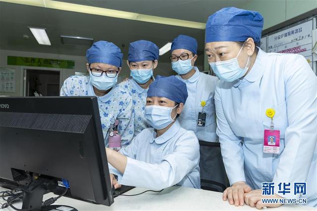 海軍軍醫(yī)大學第二附屬醫(yī)院急診、重癥醫(yī)學科護士長陳靜(坐者)與危重癥科護士交流新上線的醫(yī)囑信息系統(tǒng)使用情況(8月5日攝)。新華社發(fā)(汪輝 攝)