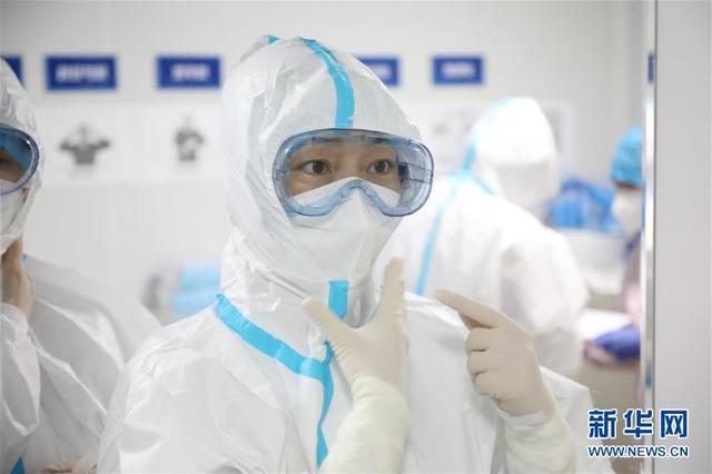 海軍軍醫(yī)大學第二附屬醫(yī)院急診、重癥醫(yī)學科護士長陳靜在武漢火神山醫(yī)院進入“紅區(qū)”前檢查防護服(3月25日攝)。新華社發(fā)(陳晨 攝)