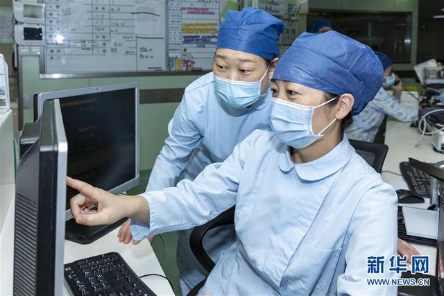 海軍軍醫(yī)大學第二附屬醫(yī)院急診、重癥醫(yī)學科護士長陳靜(右)通過監(jiān)控查看病人情況(8月5日攝)。新華社發(fā)(汪輝 攝)