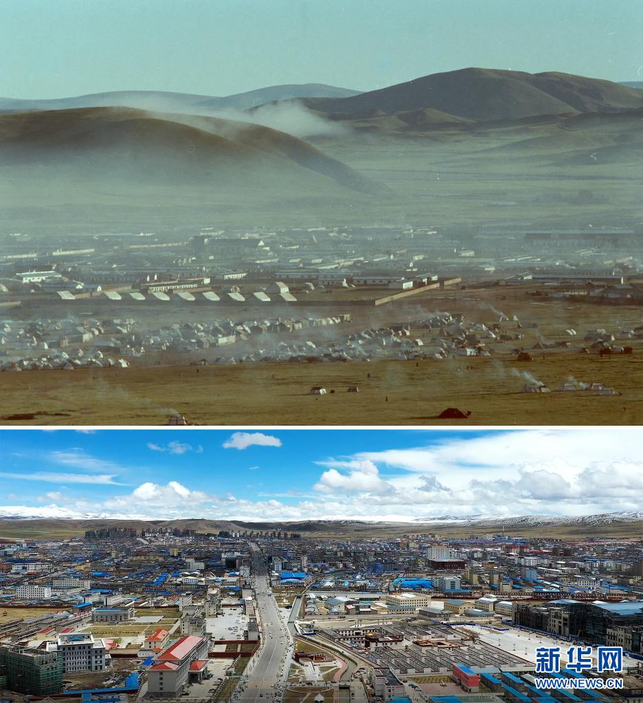 拼版照片:上圖是20世紀80年代的西藏那曲地區(qū)行署所在地那曲鎮(zhèn)(新華社記者袁克忠攝);下圖是那曲市市區(qū)風貌(新華社發(fā) 普布扎西攝,無人機視頻截圖)。新華社發(fā)