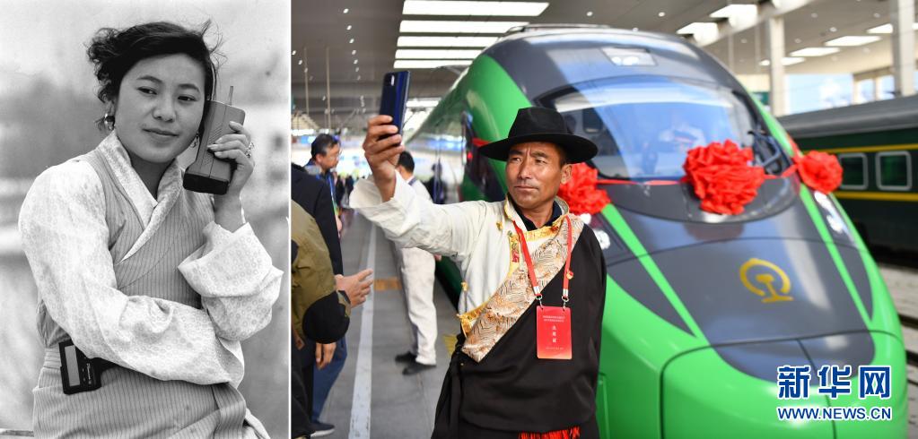 拼版照片:左圖是1994年,腰掛BP機、手持“大哥大”的藏族女商人拉珍和四川的客戶洽談生意(新華社記者土登攝);右圖是2021年6月25日,乘客與西藏首條電氣化鐵路拉林鐵路上的復興號列車自拍合影(新華社記者晉美多吉攝)。新華社發(fā)