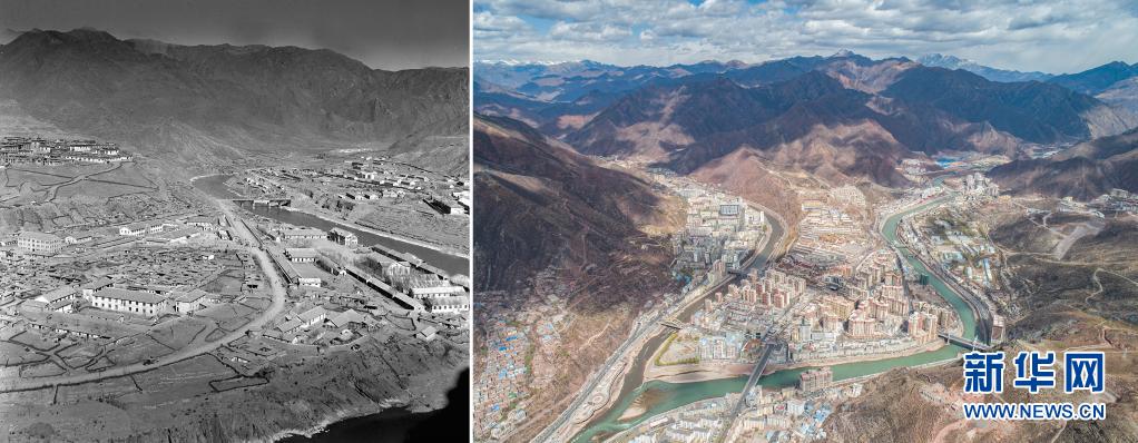 拼版照片:左圖是20世紀60年代的昌都市區(qū)一角(新華社記者任用昭攝);右圖是2021年3月25日拍攝的昌都市卡若區(qū)(新華社記者孫非攝,無人機照片)。新華社發(fā)