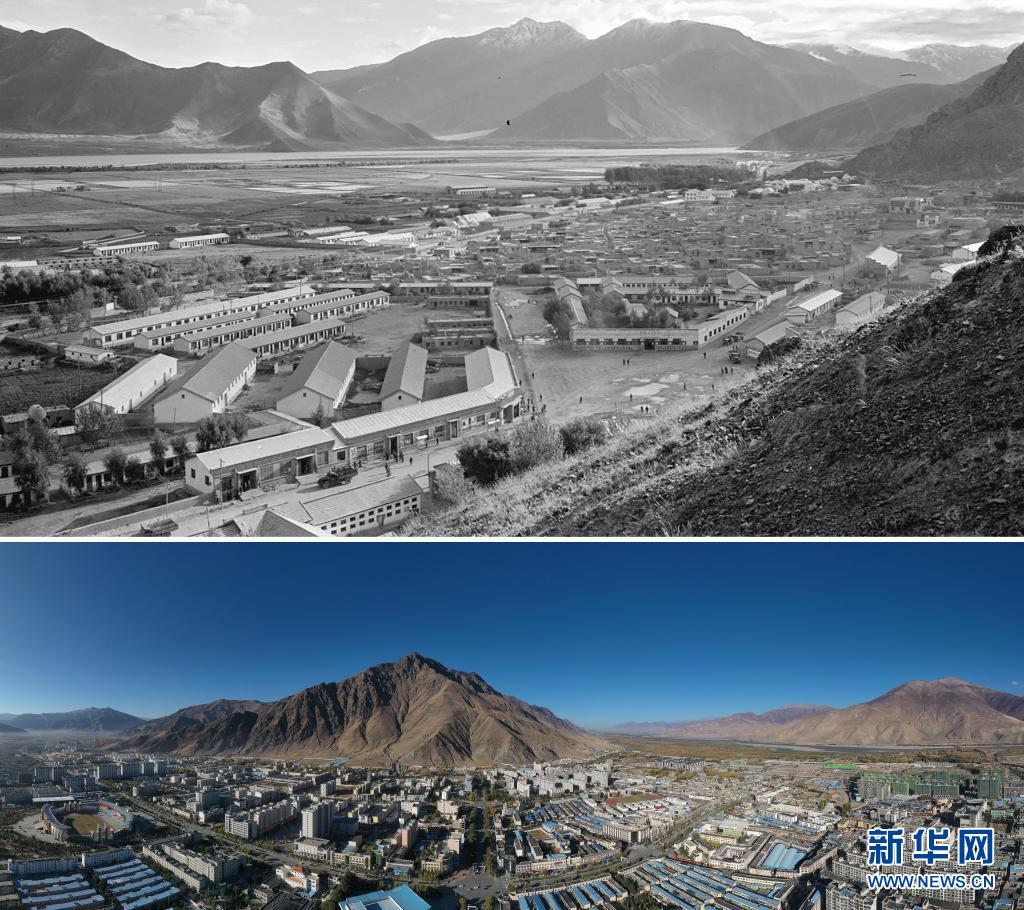 拼版照片:上圖是20世紀60年代的日喀則(資料照片);下圖是2021年8月9日拍攝的日喀則(新華社記者覺果攝)。新華社發(fā)
