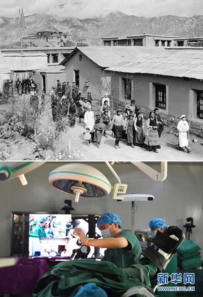 拼版照片:上圖是20世紀50年代,前往拉薩市人民醫(yī)院看病的藏族群眾在護士陪同下到醫(yī)療室去就診(新華社記者任用昭攝);下圖是2021年4月19日,拉薩市人民醫(yī)院骨科醫(yī)生通過5G通信技術,在北京積水潭醫(yī)院專家遠程指導下使用骨科機器人開展手術(新華社記者孫瑞博攝)。新華社發(fā)
