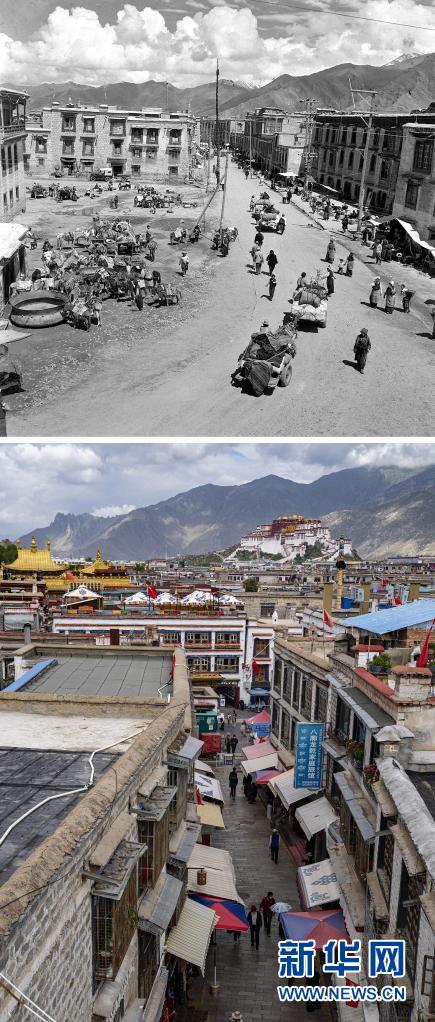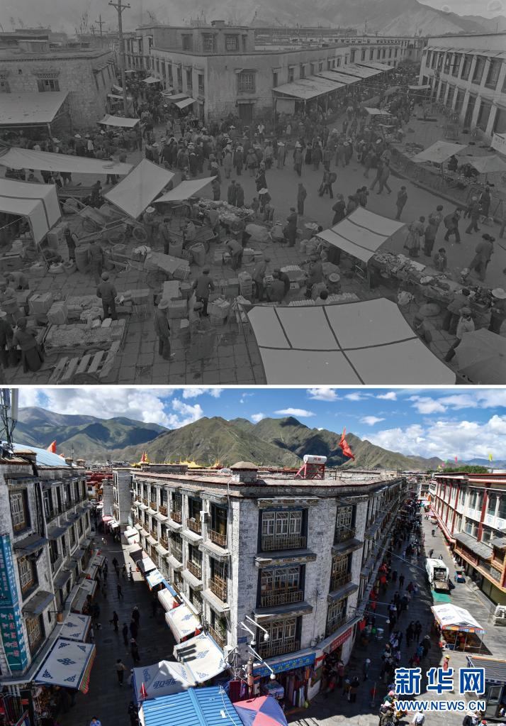 拼版照片:上圖是1959年拍攝的拉薩八廓街(新華社記者王純德攝);下圖是2021年8月13日拍攝的八廓街(新華社記者普布扎西攝)。新華社發(fā)