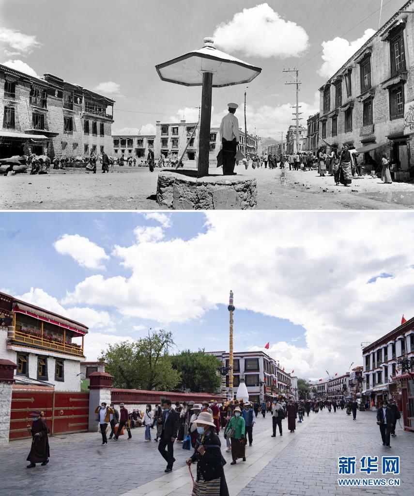 拼版照片:上圖是20世紀50年代的拉薩市八廓街(新華社記者王純德攝);下圖是2021年8月13日拍攝的拉薩市八廓街(新華社記者覺果攝)。新華社發(fā)