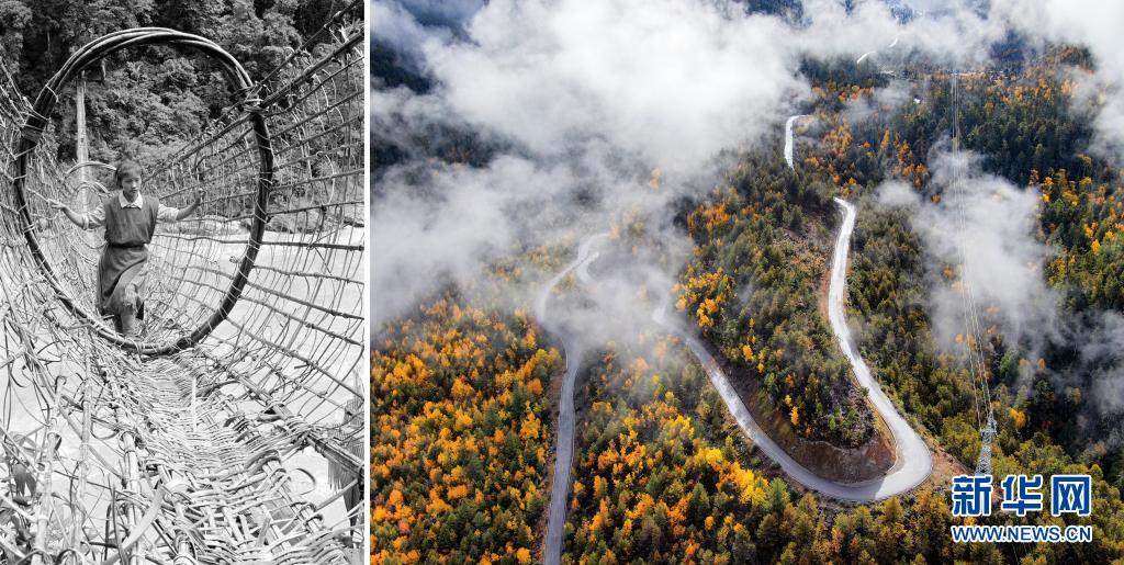 拼版照片:左圖是墨脫縣雅魯藏布江上的籐橋(20世紀80年代資料照片,新華社記者顧綬康攝);右圖是2020年11月5日拍攝的派墨公路米林段公路(新華社發(fā) 董志雄攝)。新華社發(fā)