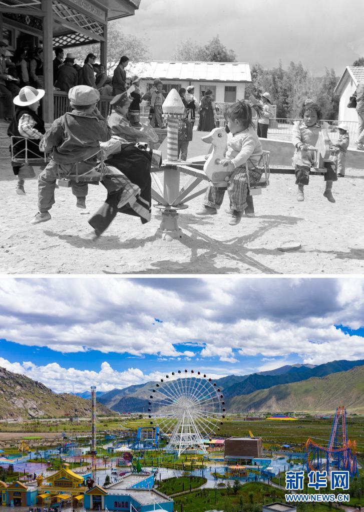 拼版照片:上圖是20世紀80年代,日喀則幼兒園的孩子們在玩動物圓盤轉(zhuǎn)椅(新華社記者程曦攝);下圖是2021年8月9日拍攝的拉薩市象雄美朵游樂園(新華社記者張汝鋒攝,無人機照片)。新華社發(fā)