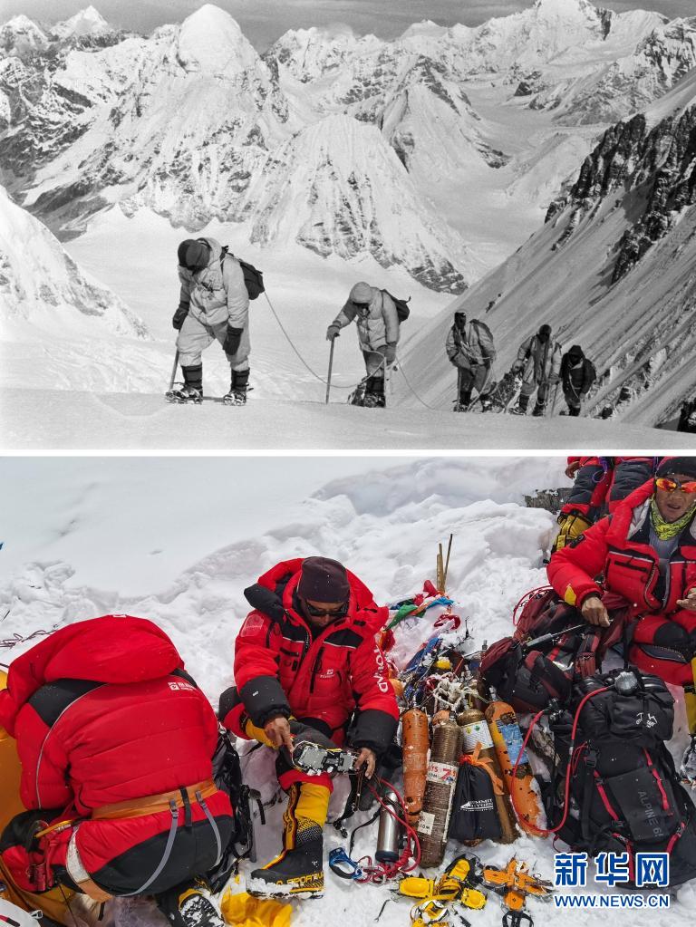 拼版照片:上圖是1960年,登山隊隊員在海拔7000米以上的雪坡上前進(資料照片);下圖是2020年5月21日拍攝的2020珠峰高程測量登山隊員所使用的現(xiàn)代登山設備(新華社特約記者拉巴攝)。新華社發(fā)