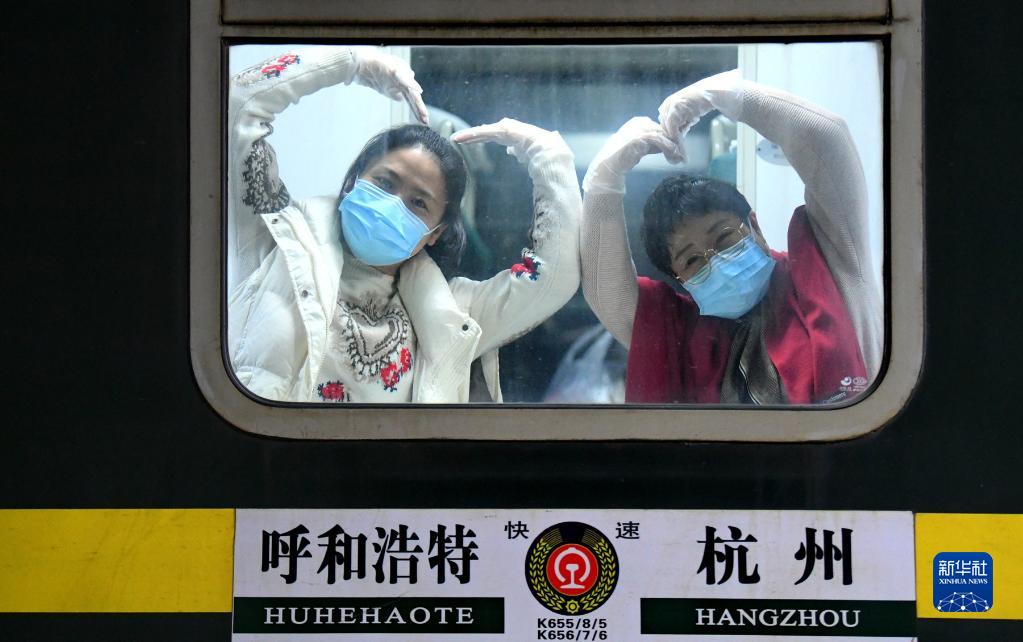10月29日,一名滯留游客離開額濟(jì)納旗時(shí),在列車車廂里用雙手比劃出“愛心”。新華社發(fā)(王磊 攝)