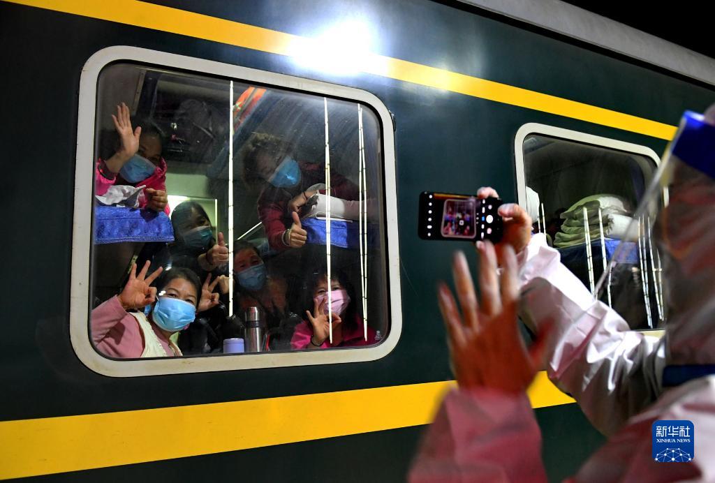 10月29日,額濟(jì)納旗滯留游客在列車車廂里與地面人員告別。新華社發(fā)(王磊 攝)