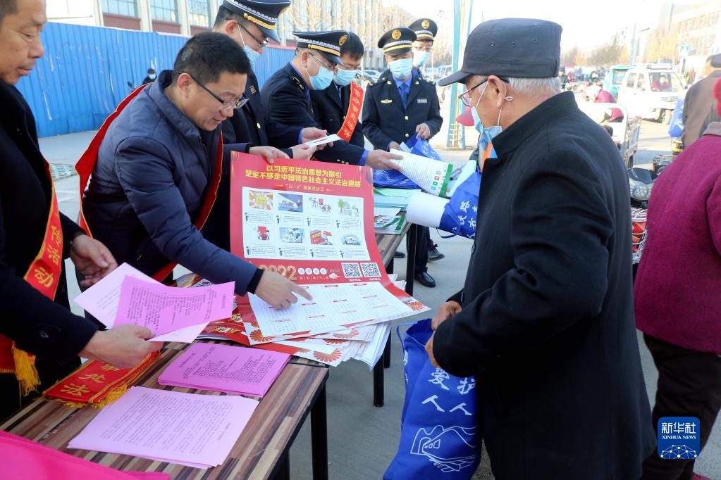 12月4日,山東省濱州市高新區(qū)的法律工作者向群眾發(fā)放普法資料。新華社發(fā)(張春峰 攝)