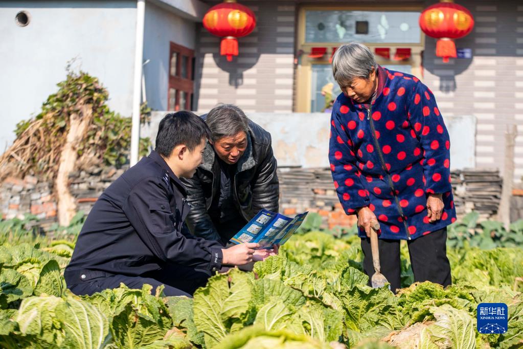 12月4日,江蘇省泰州市海陵區(qū)蘇陳派出所民警在蘇陳社區(qū)田間地頭向農(nóng)戶進(jìn)行普法宣傳?!⌒氯A社發(fā)(湯德宏 攝)