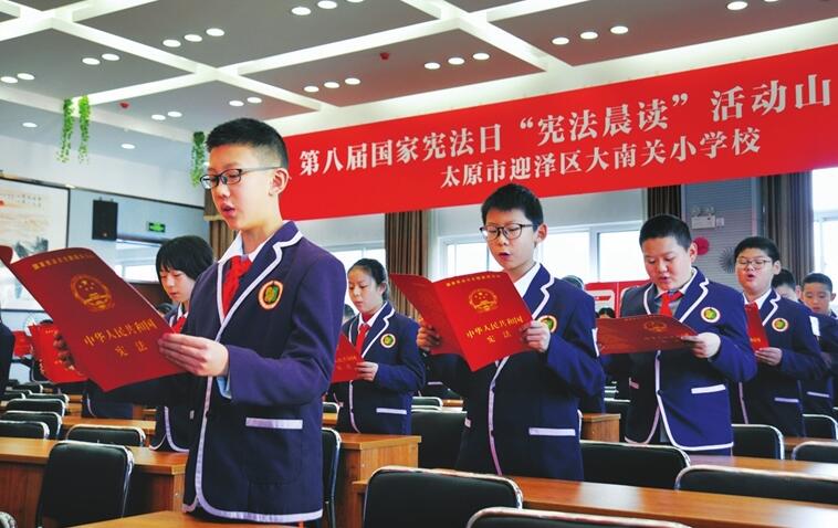 12月3日,迎澤區(qū)大南關(guān)小學(xué)開(kāi)展“憲法晨讀”活動(dòng)。該校作為第八屆國(guó)家憲法日“憲法晨讀”山西分會(huì)場(chǎng),通過(guò)讓學(xué)生們朗讀憲法、收看直播等方式宣傳憲法知識(shí)。(徐浩軒 攝)