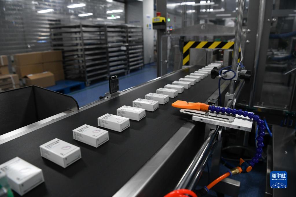 在安徽智飛龍科馬生物制藥有限公司新冠疫苗生產(chǎn)線上,工作人員對疫苗進(jìn)行包裝(5月20日攝)。新華社記者 黃博涵 攝