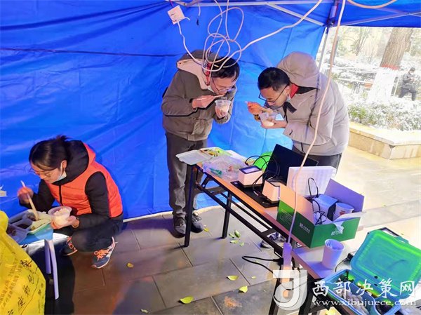 正當(dāng)隊員們準(zhǔn)備修整一天時,新的命令到了,要求醫(yī)療隊安排300名隊員支援雁塔區(qū)核酸采集工作,大家毫無怨言,坐上了趕赴雁塔區(qū)的大巴。這是最不尋常的一天,醫(yī)療隊承擔(dān)了雁塔區(qū)近10個居民區(qū)的核酸采樣任務(wù),且大部分都屬于封控區(qū)。核算采樣需上門采集,風(fēng)險大、難度高,因為信息采集設(shè)備無法上樓,只能依靠人工信息錄入,隊員們身穿防護(hù)服,在操作極其困難的情況下做到了不漏一戶,不落一人。采集結(jié)束已是25日凌晨1點,來自漢臺區(qū)的余晗和趙凌最后的采集任務(wù)已是凌晨2點,此時的千年古都正飄落著冬日的雪花。這次入戶采集共完成49081人次。