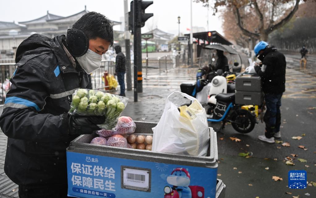 12月25日,外賣人員張欣(左一)在西安市小寨東路一封控小區(qū)配送蔬菜。這幾天,他的業(yè)務(wù)量是平時的兩倍。新華社記者 陶明 攝