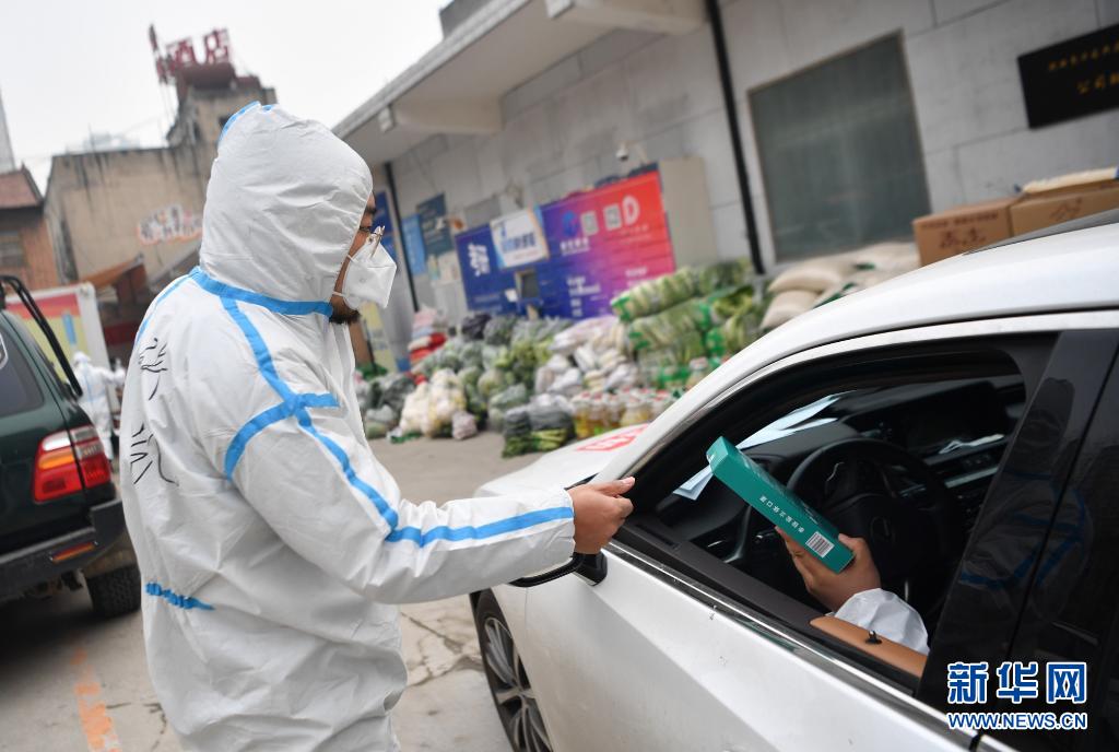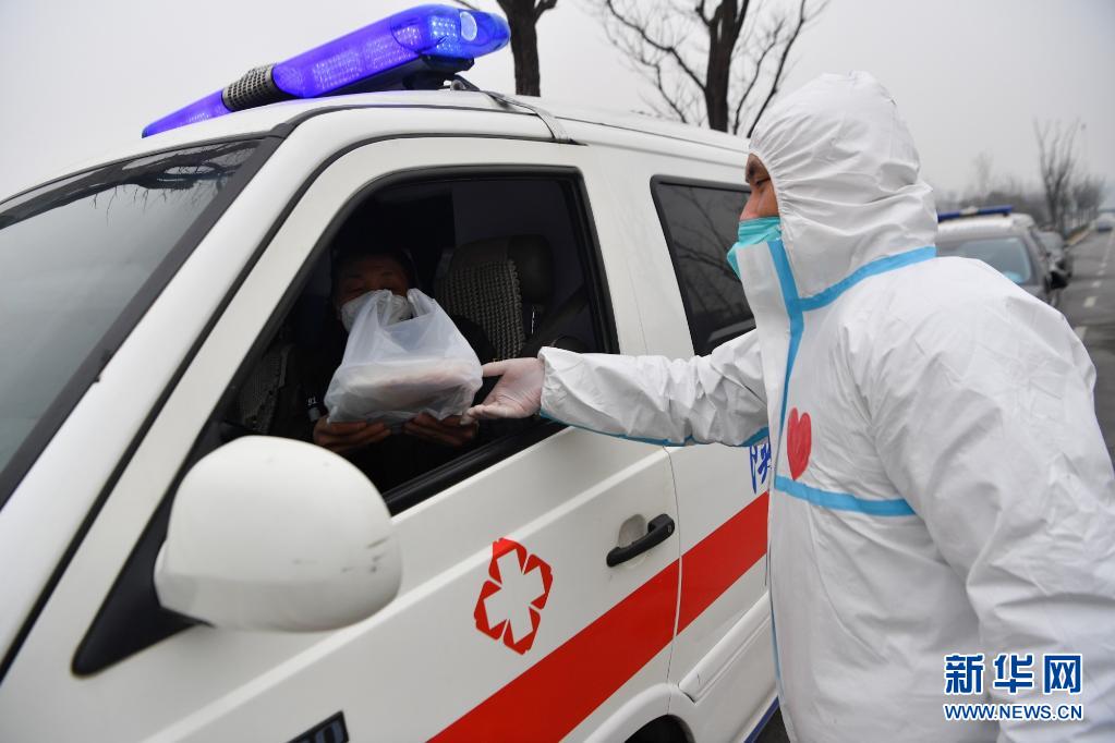 1月4日,在西安市雁塔區(qū),志愿者暢璘將食品送至一位負責運輸核酸檢測樣本的救護車駕駛員手中。新華社記者 張博文 攝