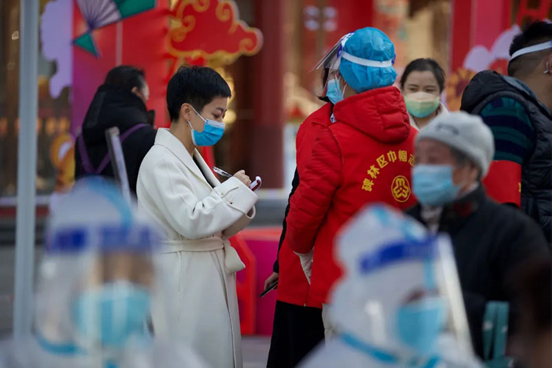 2021年12月23日,咸陽日?qǐng)?bào)社記者李石(左)在全員核酸檢測(cè)點(diǎn)采訪。