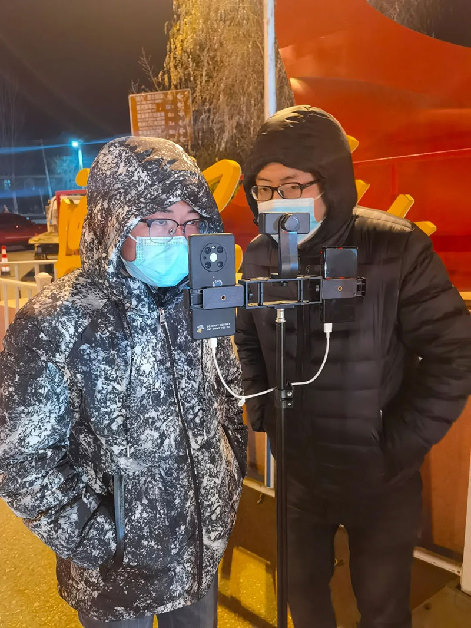 2021年12月24日,陜西日?qǐng)?bào)社延安站記者陳宏江(左)在延安北高速公路口疫情防控檢查站采訪執(zhí)勤交警。