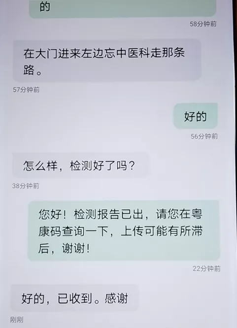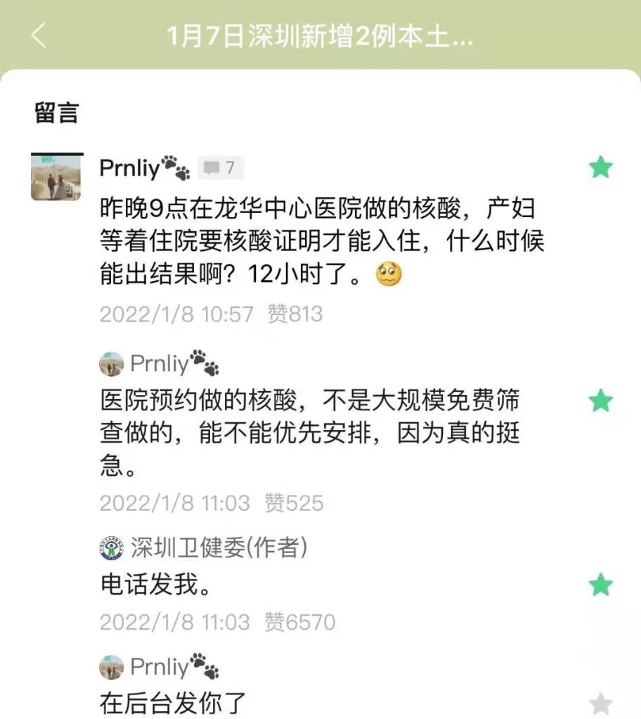 8日上午10時57分,在“深圳衛(wèi)健委”的微信公眾號推文下,一位叫“Prnliy”的網(wǎng)友留言,引起深圳市衛(wèi)健委工作人員的關(guān)注。這位網(wǎng)友說:“昨晚9點(diǎn)在龍華中心醫(yī)院做的核酸,產(chǎn)婦等著住院要核酸證明才能入住,什么時候能出結(jié)果啊?12個小時了。”